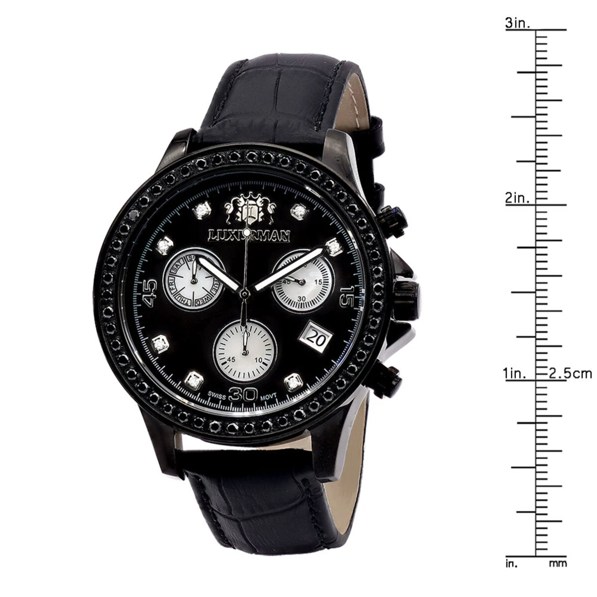This watch is from our men’s diamond watches collection. This 2 Carat Black Diamond Bezel Watch for Men by Luxurman showcases 2 carats of sparkling round diamonds. Features a black dial with three subdials and a black leather band. This luxurious men’s diamond watch by Luxurman houses a fine Swiss-made quartz movement and comes in a retail box with two interchangeable straps in different colors (band colors may vary).