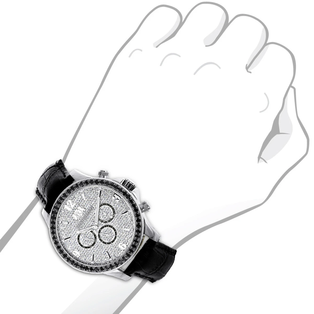 Luxurious Luxurman Watches! This Men’s Black Diamond Watch showcases 3 carats of genuine diamonds on the bezel, a face paved in white sparkling stones with three subdials, a silver stainless steel case and a black genuine leather band. This men’s diamond wrist watch by LUXURMAN houses a fine Swiss-made quartz movement, and is conveniently water-resistant. This men’s diamond watch is also available with metal band shown in the video.