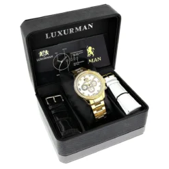 This Luxurman Men’s Diamond Liberty Watch White MOP is 18k Yellow Gold Plated and features 2 carats of genuine diamonds. Showcasing a luxurious white mother of pearl face, a yellow gold plated stainless steel case and yellow gold plated stainless steel band, this Luxurman Liberty watch is conveniently water-resistant to 3 ATM and comes with a 5 year manufacturers warranty. This stylish men’s Luxurman watch makes a perfect gift for any occasion! The watch includes two extra leather bands in different colors.