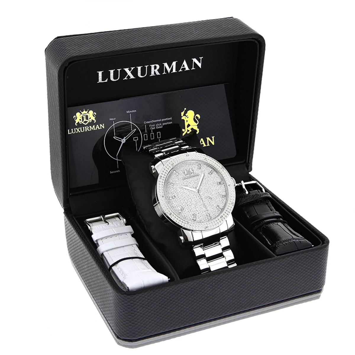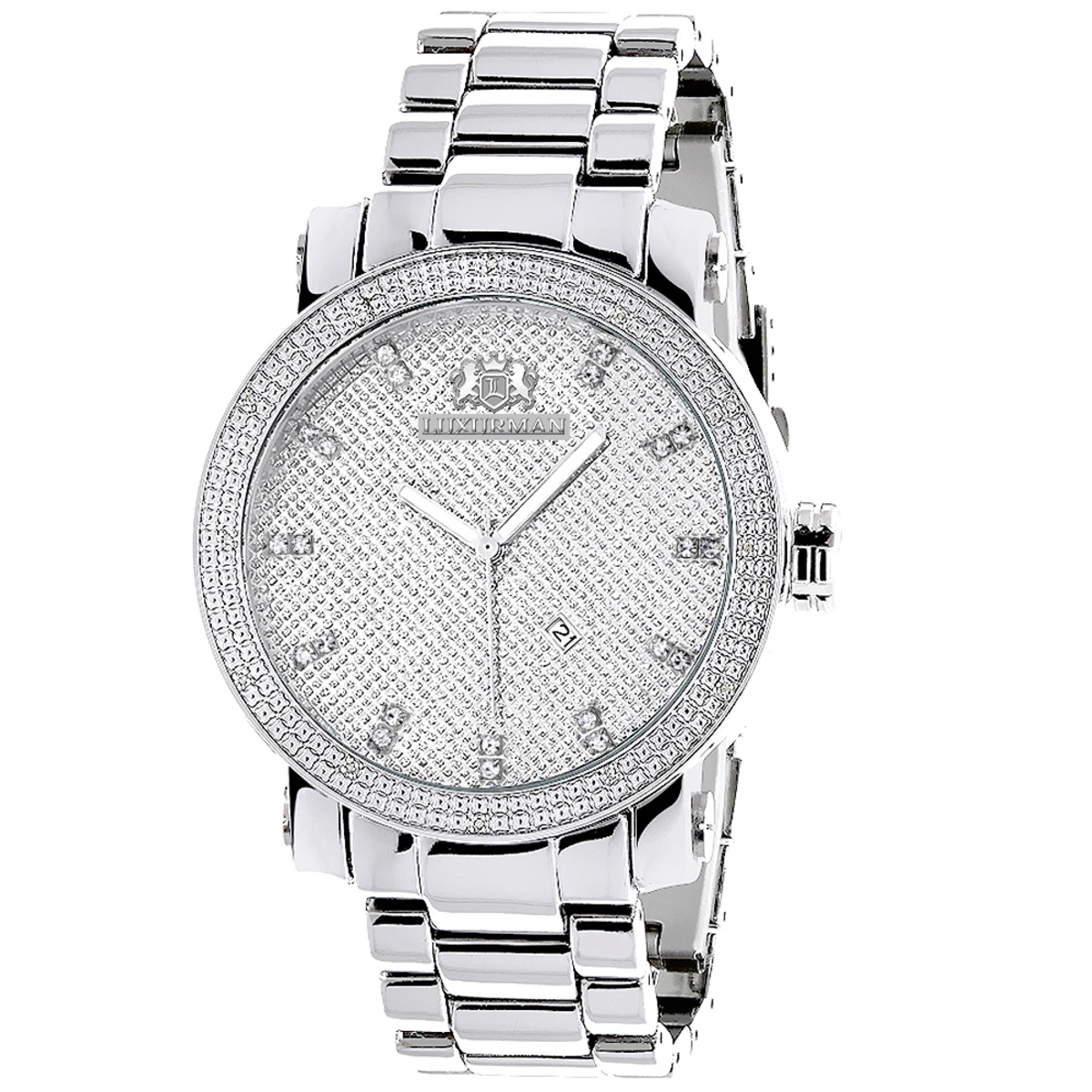 This Luxurman Men’s Diamond Watch with a Stainless Steel Band is a limited edition men’s wrist watch and features 0.12 carats of genuine diamonds around the bezel, a polished silver stainless steel case with a stainless steel band and a dial paved in sparkling stones. This LUXURMAN diamond watch is water-resistant and makes a fabulous gift for any occasion.