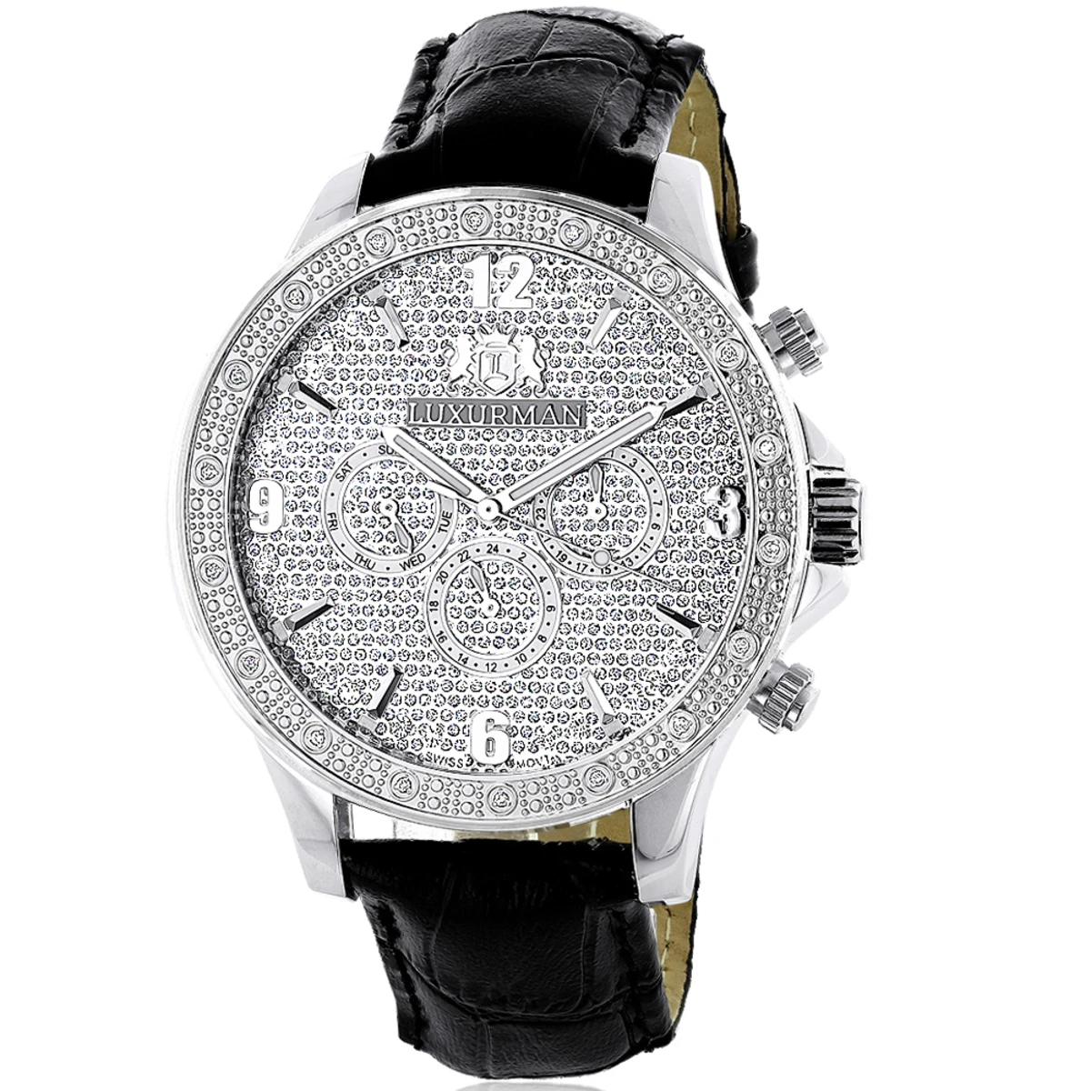 From our exclusive diamond watches collection this Luxurman Men’s Diamond Watch features 0.18 carats of genuine diamonds, a polished silver tone stainless steel case, a black genuine leather strap and the face paved in white sparkling stones. This Luxurman diamond watch showcases a fine Swiss-made quartz movement and is water-resistant to 30 m (110 ft).
