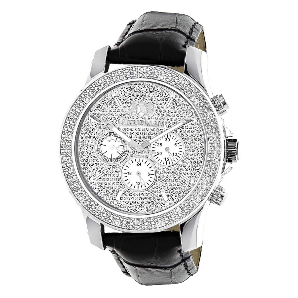 0.25 carats of diamonds, polished silver stainless steel case with black genuine leather strap and silver stainless steel face paved in white stones with three chronograph subdials. Fine Japan-made quartz movement. Water-resistant to 30 m (110 ft).