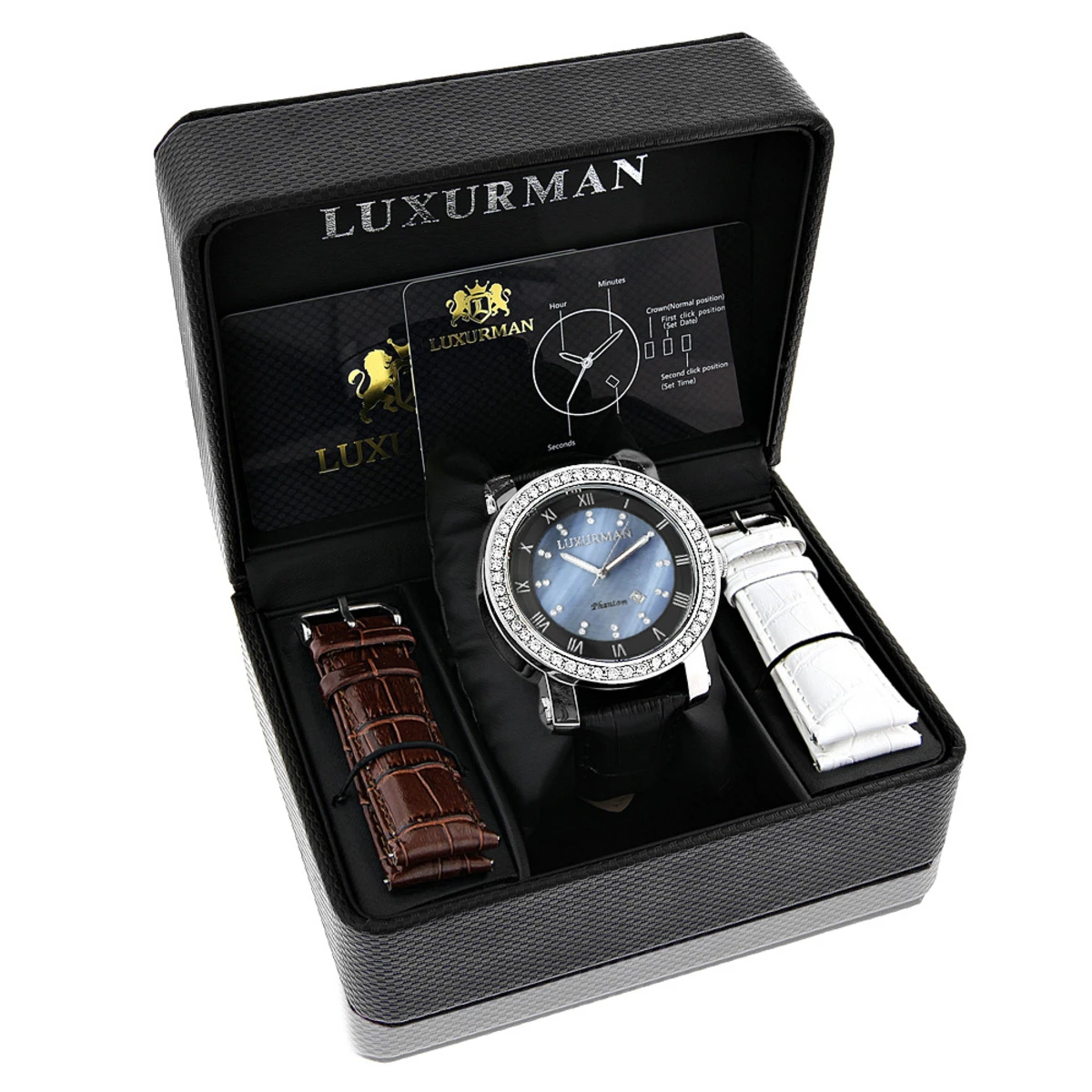 This Luxurman men’s diamond watch features 4 carats of VS quality white sparkling diamonds, polished silver stainless steel case with a soft genuine black leather band and a blue mother of pearl dial with day, date and 24 hours subdials. Water-resistant to 30 m (110 ft).