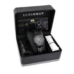 Unique Luxurman Watches: This Oversized Women’s Black Diamond Watch showcases 2.15 carats of sparkling black diamonds. This Luxurman diamond watch features a black mother of pearl dial paved in sparkling stones with three subdials, a black tone stainless steel case and a polished black tone stainless steel band.