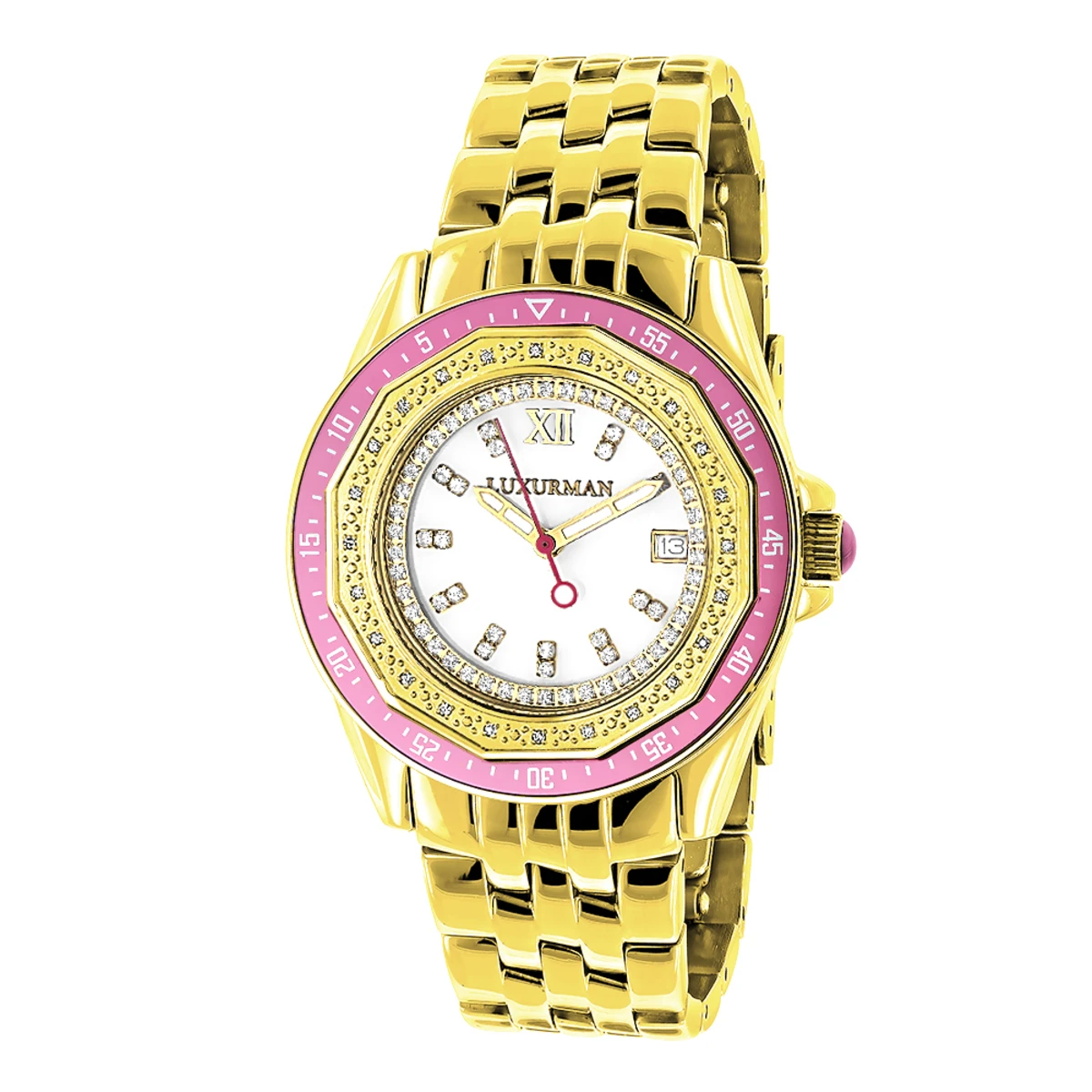 This Luxurman Women’s Diamond Watch showcases 0.25 carats of genuine diamonds and features a polished yellow gold plated stainless steel case with a yellow gold plated stainless steel band, a pretty pink bezel that turns to give you ability to time your activities and a luxurious white mother of pearl face with a date display at a 3 o’clock position. This fabulous ladies diamond watch by Luxurman houses a fine Japan-made quartz movement and is conveniently water-resistant to 30 m (110 ft).