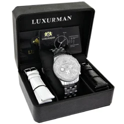 Matching His and Hers Watches: Luxurman Diamond Bezel Watch Set 6ct , these two matching diamond watches feature a total of 6 carats of diamonds (3ct in men’s diamond watch and 3ct in women’s diamond watch), high quality stainless steel cases and bands, iced out dials with 3 subdials with date, calendar and 24 hours. Each watch in this elegant Luxurman diamond watch set comes with two extra interchangeable leather straps in different colors, straps feature quick release mechanism for easy removal/exchange giving you a lot of different options to wear the watches. Giving your partner a Luxurman Diamond Watch will surely garner their attention and ensure that you are both at the leading edge of fashion as you go out together.