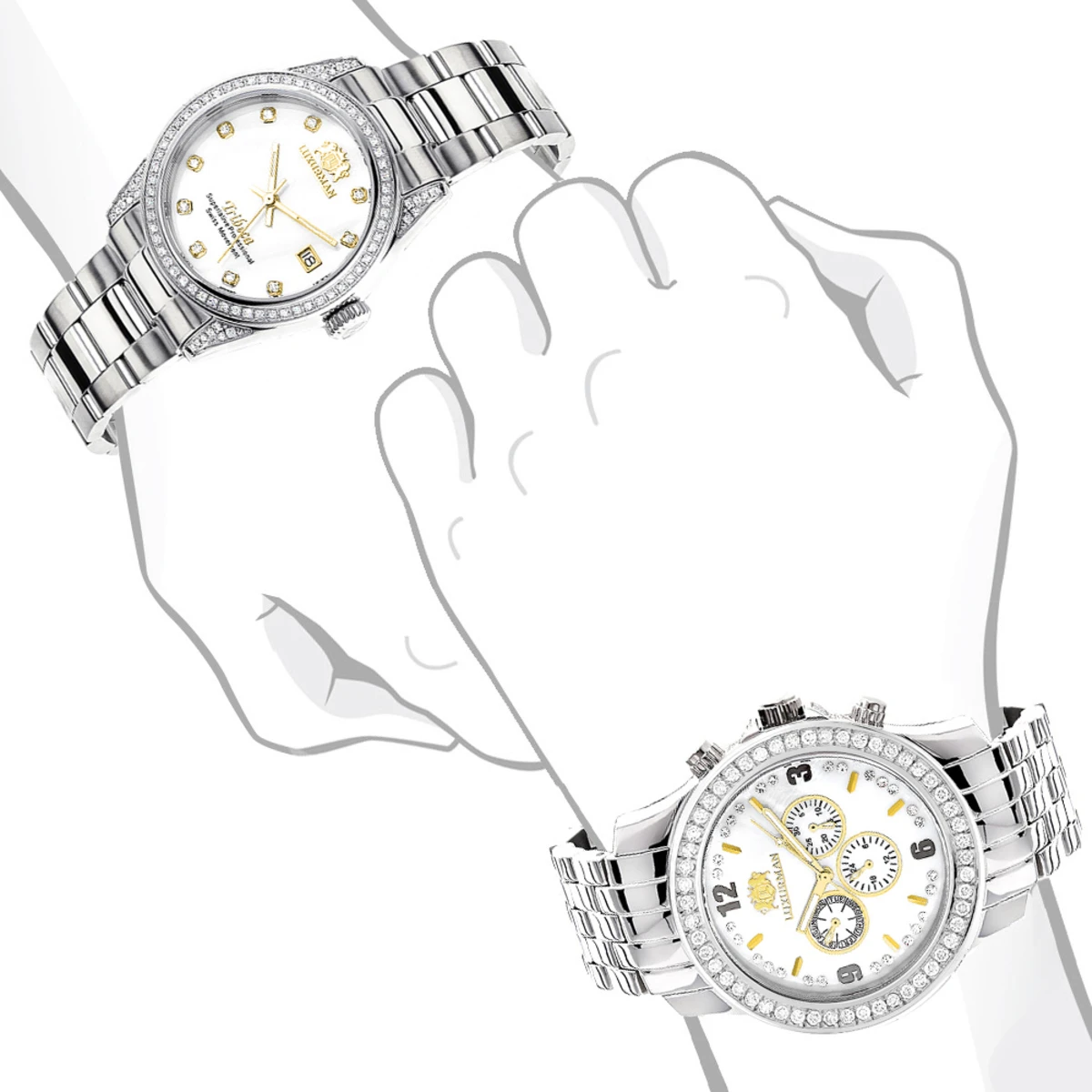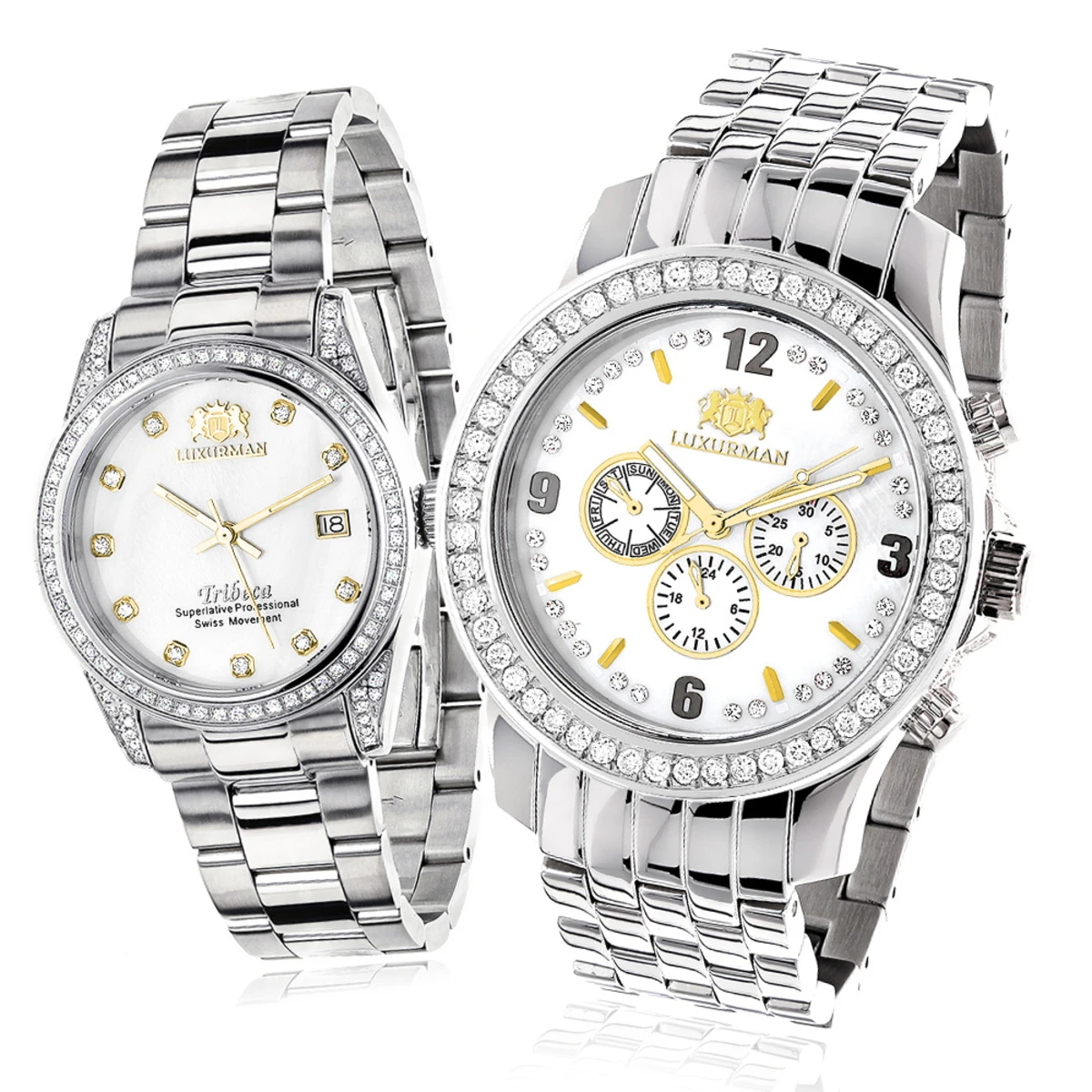 Matching His And Hers Luxurman Diamond Watch Set Gold Plated 4ct