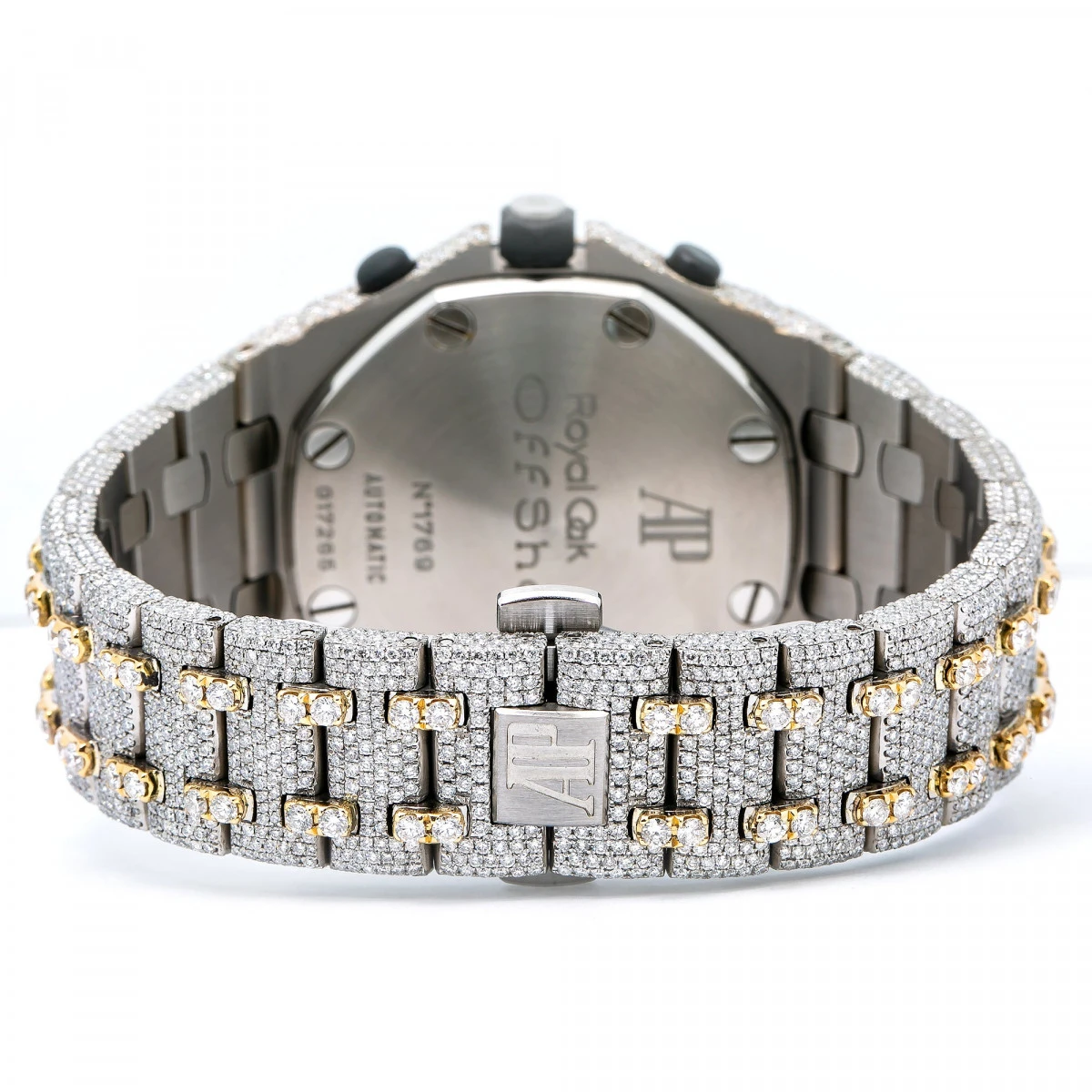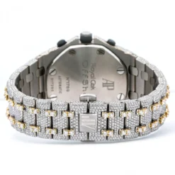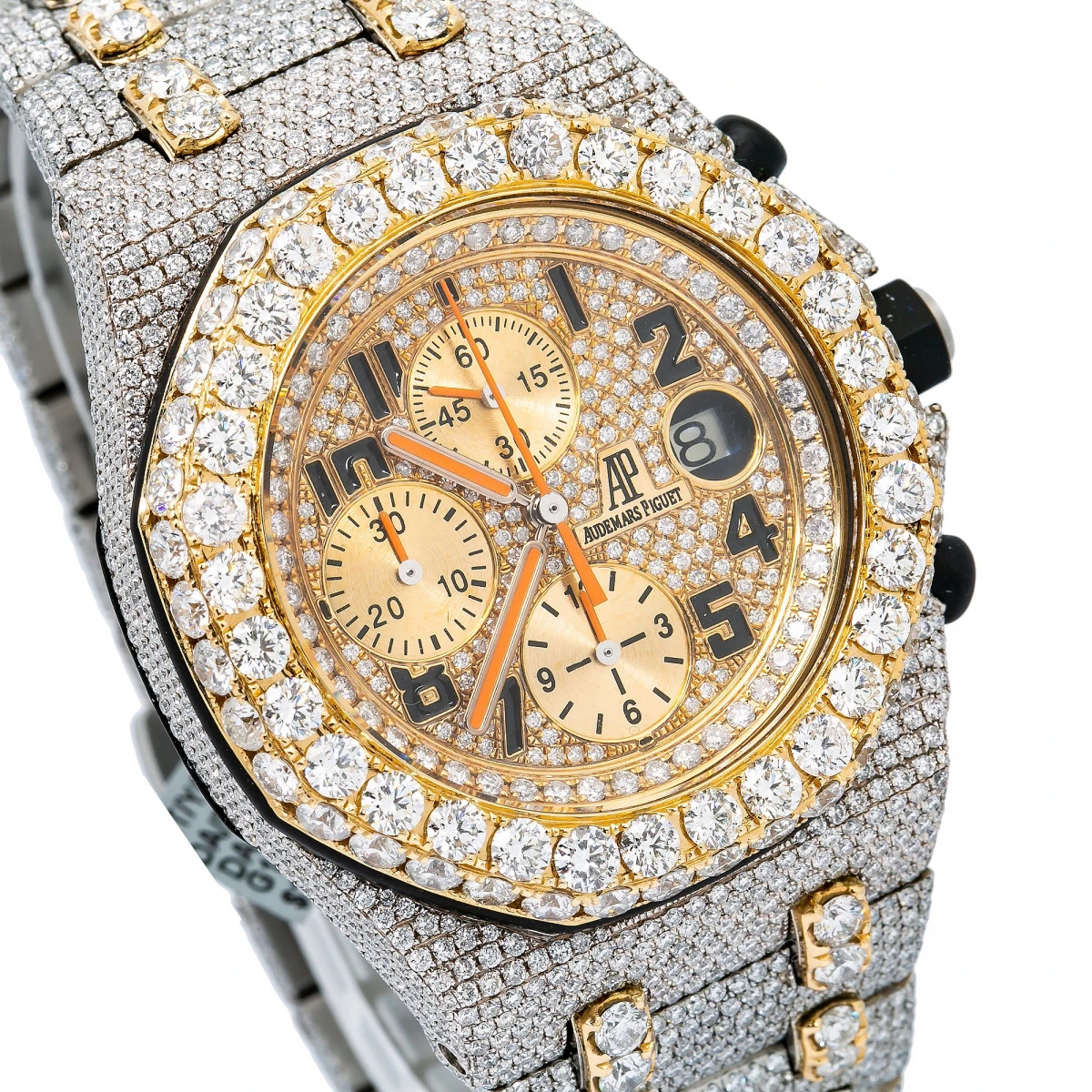 The Audemars Piguet Royal Oak Offshore Men’s Gold Diamond Watch is a luxurious timepiece that exudes sophistication and style. This watch features a yellow dial with diamond markers and a bezel set with 31.25 carats of white diamonds. The case is crafted from 18K gold and features a 42mm diameter. The bracelet is made from a combination of 18K gold and stainless steel, and is finished in a striking yellow hue. The watch is powered by an automatic movement and is water resistant up to 100 meters.This watch is perfect for the man who appreciates the finer things in life. It is a timeless piece that will never go out of style. The diamonds add a touch of sparkle and glamour, while the yellow dial adds a touch of warmth and sophistication. The combination of gold and stainless steel gives the watch a modern look that is sure to turn heads. The engravable case back makes this watch a perfect gift for a special occasion.The Audemars Piguet Royal Oak Offshore Men’s Gold Diamond Watch is a luxurious timepiece that will stand the test of time. With its timeless design and luxurious materials, this watch is sure to be a treasured piece for years to come.