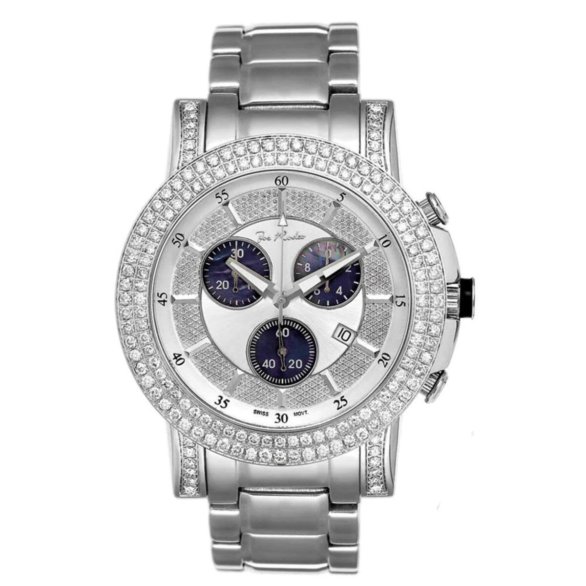 This luxurious Men’s Diamond Watch – Joe Rodeo Trooper features 6.00 full carats of round diamonds that sparkle from its bezel and lugs. The silver stainless steel face has three large white chronograph subdials and a date display window at the 4 o’clock position. This Joe Rodeo watch comes with a fine Swiss-made quartz movement with a chronograph function, a center second and date indicator. This diamond watch is water-resistant to 100 meters and comes with two interchangeable straps in different colors. The patented strap adjusts once for a perfect fit, and comes on and off with the press of a button.