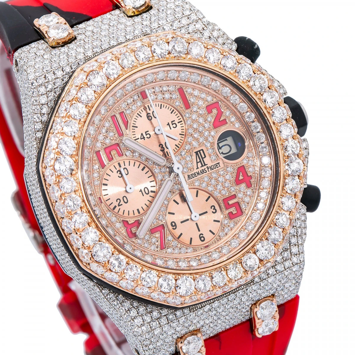 The Audemars Piguet Royal Oak Offshore Rose Gold W01257 is a magnificent men’s watch that is sure to turn heads. Crafted from 18K rose gold, this watch features a bezel set with 17.25 carats of white diamonds, a sapphire crystal, and a rose gold tone dial set with diamonds. The 42mm case is complemented by a red rubber bracelet and a 5-year warranty. This watch is powered by an automatic movement and is water resistant up to 100 meters.The Royal Oak Offshore Rose Gold W01257 is a stunning timepiece that is sure to make a statement. The sapphire crystal is scratch-resistant and provides a clear view of the rose gold tone dial, which is set with diamonds.With its luxurious design and quality craftsmanship, the Royal Oak Offshore Rose Gold W01257 is sure to be a treasured timepiece for years to come.