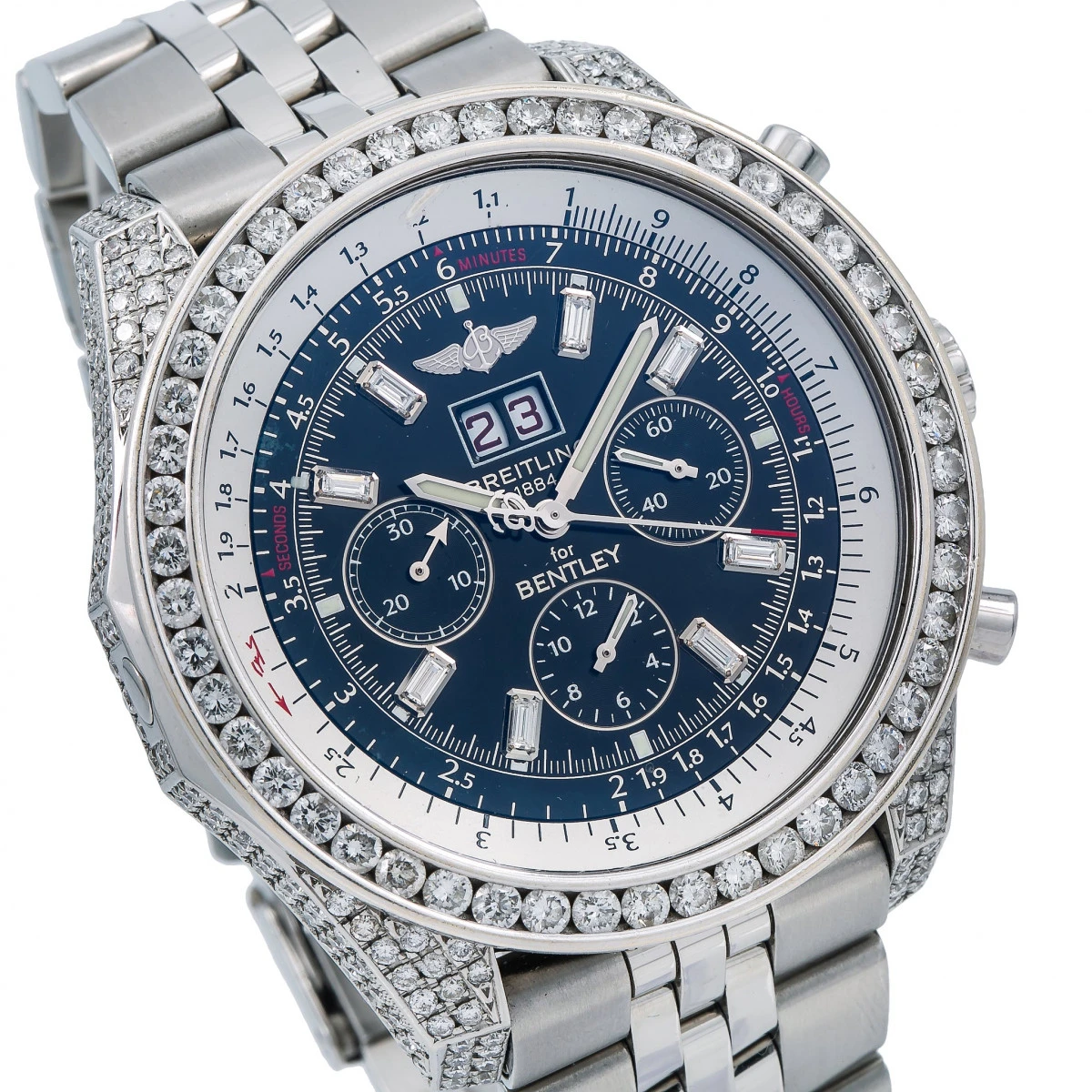 Introducing the Breitling Bentley 48mm Black Dial Men’s Diamond Watch. This exquisite timepiece is crafted from stainless steel and features a white diamond bezel with 11.75 carats of white diamonds. The black dial is protected by a scratch-resistant sapphire crystal and is powered by an automatic movement. The stainless steel bracelet is adjustable and comfortable to wear.This Breitling Bentley watch is a luxurious and sophisticated timepiece that is sure to turn heads. The 48mm case diameter is perfect for any wrist size and the white diamond bezel adds a touch of sparkle to the watch. The black dial is easy to read and the automatic movement ensures accurate timekeeping.This Breitling Bentley watch is water-resistant up to 100 meters and comes with a 5-year warranty. It is also engravable, making it a perfect gift for any special occasion. With its timeless design and luxurious features, this Breitling Bentley watch is sure to become a treasured heirloom.