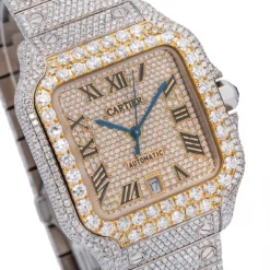 The Cartier Santos de Cartier 40mm Yellow Dial Men’s Diamond Watch is a stunning timepiece that will make a statement wherever you go. This watch features a stainless steel case with a yellow bezel set with 19.25 carats of white diamonds. The yellow dial is adorned with Roman numerals and is protected by a sapphire crystal. The stainless steel bracelet is set with diamonds and is adjustable for a comfortable fit. The watch is powered by an automatic movement and is water resistant up to 100 meters.This watch is the perfect accessory for any man who wants to make a statement. The yellow bezel and dial are eye-catching and the diamonds add a touch of luxury. The stainless steel case and bracelet are durable and will last for years to come. The automatic movement ensures accurate timekeeping and the water resistance makes it suitable for everyday wear.The Cartier Santos de Cartier 40mm Yellow Dial Men’s Diamond Watch is a timeless piece that will never go out of style. It is the perfect addition to any man’s wardrobe and will be sure to draw attention wherever you go. With its luxurious design and quality craftsmanship, this watch is sure to be a treasured piece for years to come.