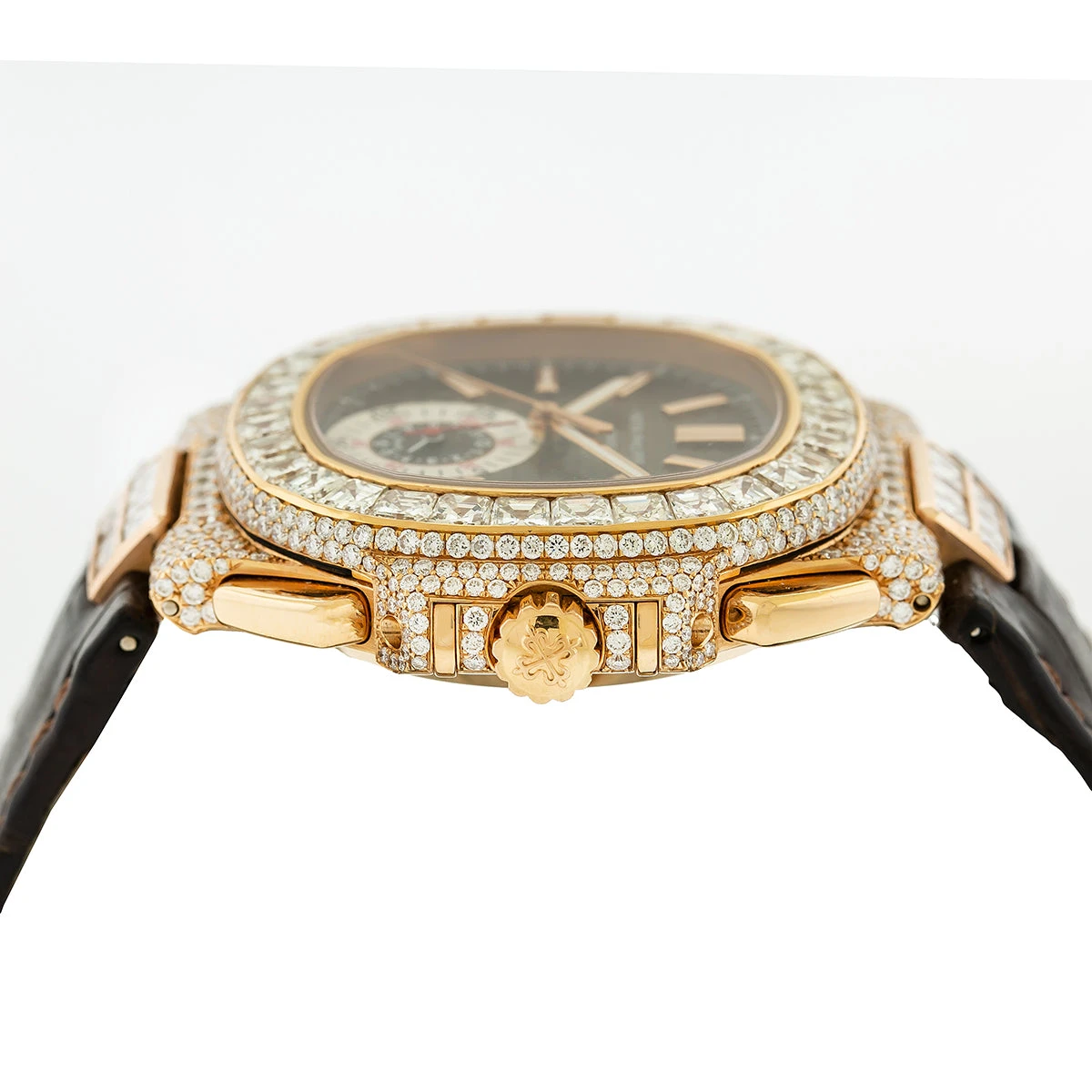 The Patek Philippe Nautilus 40.5mm Men’s Diamond Watch is a luxurious and timeless timepiece. Crafted from 18K rose gold, this watch features a bezel set with 14.5 carats of sparkling white diamonds. The case is 40.5mm in diameter and is protected by a scratch-resistant sapphire crystal. The brown leather bracelet is comfortable and stylish, and the watch is water resistant up to 120 meters. The watch is engraved with the Patek Philippe logo, and comes with a 5-year warranty.This watch is perfect for any special occasion, from a night out on the town to a formal event. The diamonds add a touch of elegance and sophistication, while the rose gold adds a hint of warmth. The watch is sure to make a statement and will be a treasured piece for years to come. The Patek Philippe Nautilus 40.5mm Men’s Diamond Watch is a timeless classic that will never go out of style.