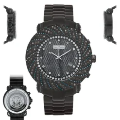 Unique Men’s Joe Rodeo Watches: This Blue Black Diamond Watch – Joe Rodeo Junior – features 4.25 carats of sparkling black and blue diamonds on the bezel and lugs of the black stainless steel case; and the stainless steel band. This exquisite Joe Rodeo diamond watch showcases a dial paved in white sparkling stones with a second, 30-minute, 1/8 of a second chronograph subdials, a date display window at the 4 o’clock position, and a row of white stones around it. This luxurious men’s diamond watch by Joe Rodeo is equipped with a super accurate Swiss-made chronograph quartz movement. The case is water-resistant to 100m (330 ft).