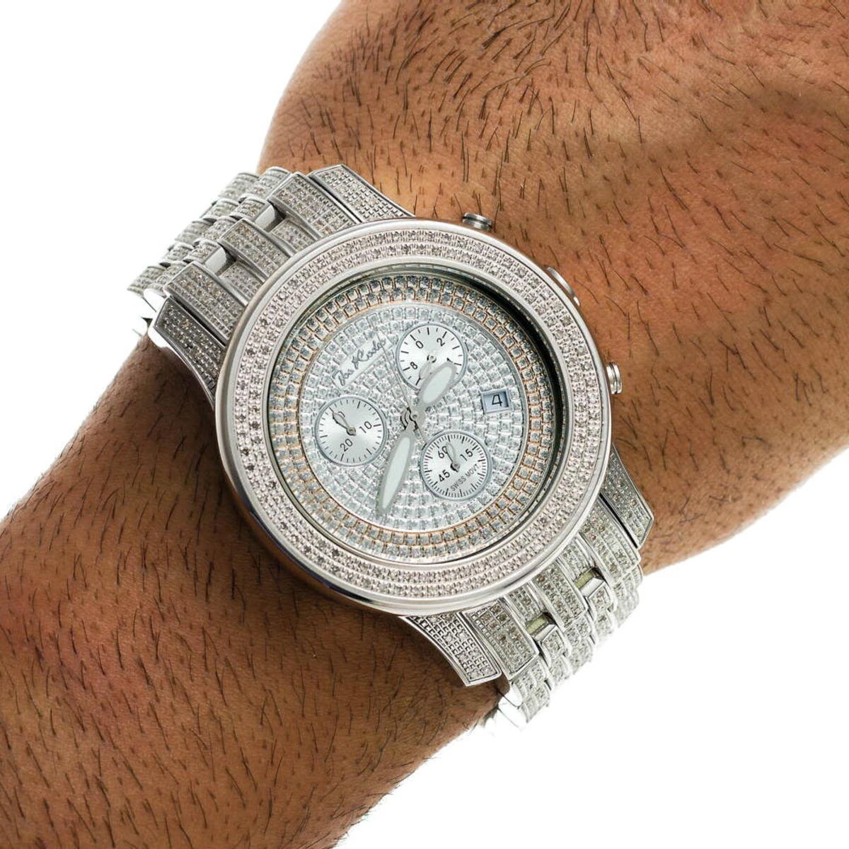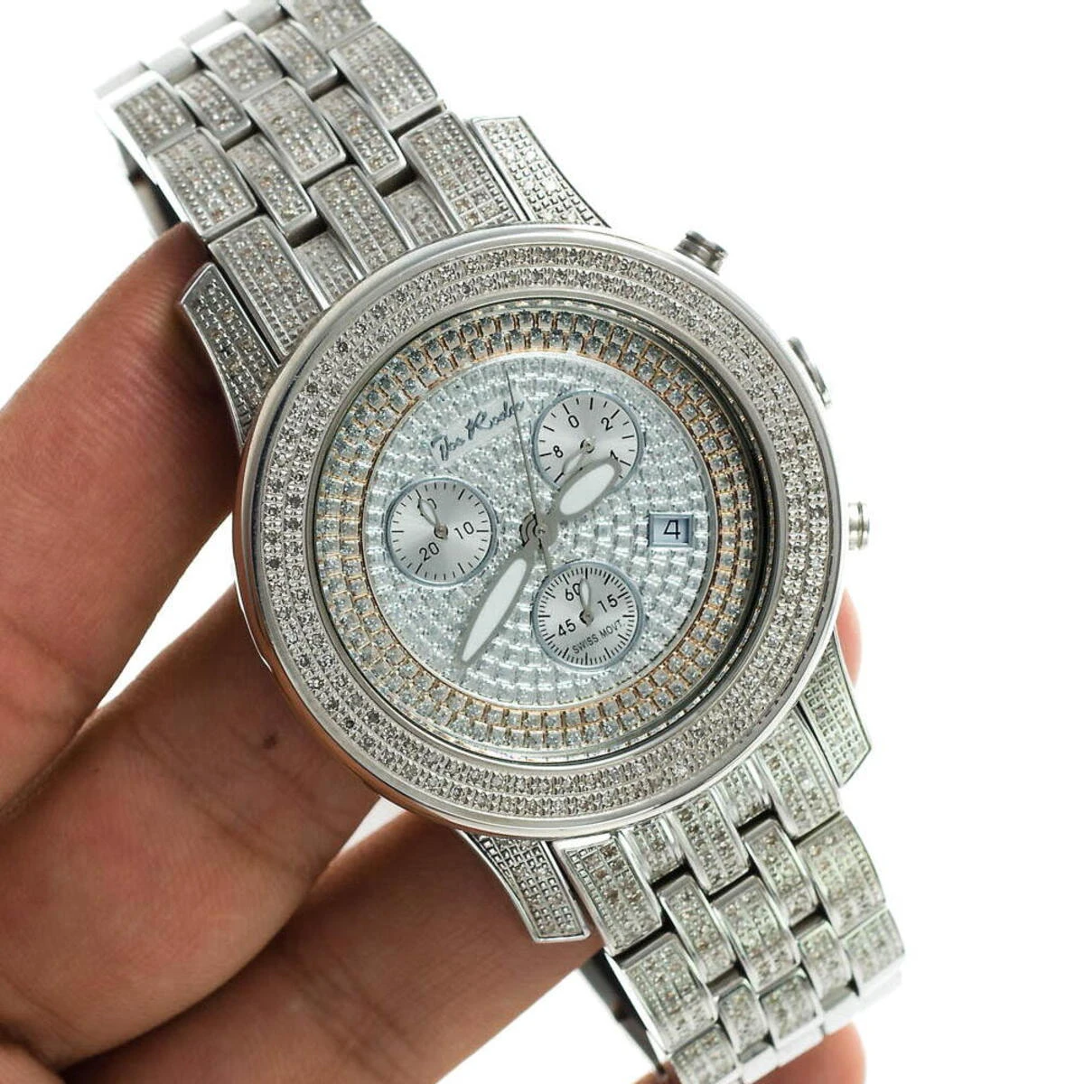 This Men’s Joe Rodeo Watch with a Diamond Band is adorned with 3.50 carats of authentic diamonds that really sparkle! With diamonds on the bezel and lugs, this men’s diamond watch from iced out watches collection by Joe Rodeo features diamonds going half way around the strap. The Swiss-made chronograph quartz movement sits in the stainless steel case that is water resistant to 100M (330 FT). Comes with extra two interchangeable leather bands.