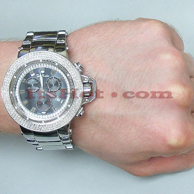 Introducing new version of 4-carat men’s Joe Rodeo Watch with the silver stainless steel case, a scratch-free crystal glass and stainless steel band. Three rows of beautiful cut to perfection round sparkling diamonds are skillfully set around the bezel. The black mother of pearl face has three chronograph subdials, a date display window at 4 o’clock position and a row of glistening white stones around it. This men’s diamond watch from Joe Rodeo watches collection is equipped with a super accurate Swiss-made chronograph quartz movement. The case of this luxurious timepiece is water-resistant 100m (330 ft).