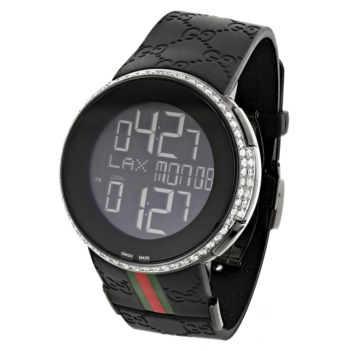 Genuine Gucci men’s luxury watch features 2.5 carats of sparkling white diamonds around the black stainless steel case, a scratch resistant sapphire crystal, a black rubber strap with green/red/green web and a digital dial code. This men’s Gucci diamond watch showcases a fine Swiss-made movement and is water-resistant to 30 m (100 ft).