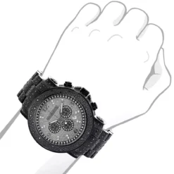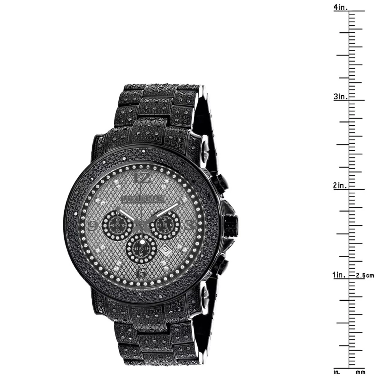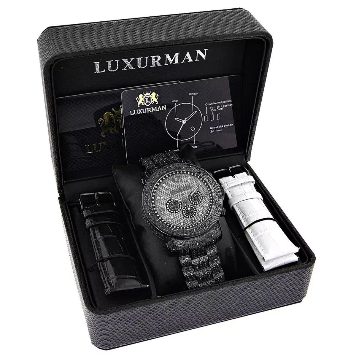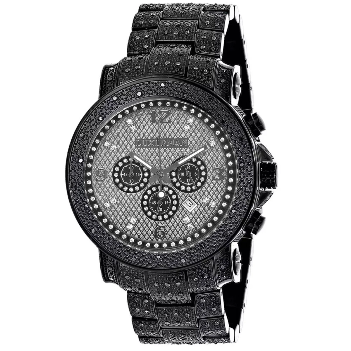 This Oversized Iced Out Black Diamond Men’s Watch by Luxurman is fully paved with 2 carats of black diamonds, and features a black tone stainless steel case and a polished stainless steel band paved with black diamonds. The dial of this LUXURMAN wrist watch is paved in white sparking stones and showcases three black chronograph subdials with date, day and 24 hour display. This Luxurman men’s black diamond watch makes a unique gift for a special occasion.