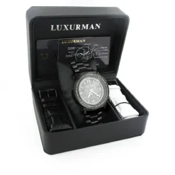 This Oversized Men’s Black Diamond Watch Iced Out Luxurman with Chronograph in Black Stainless Steel showcases 3 carats of sparkling black diamonds. Features a unique iced out dial with three chronograph subdials, a date display window at the 4 o’clock position, and a black tone stainless steel bracelet. This luxurious men’s diamond watch by Luxurman comes with two extra interchangeable leather straps in different colors (band colors may vary).