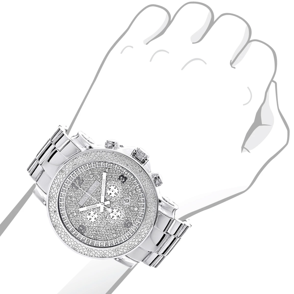This Oversized Men’s Diamond Watch Luxurman Escalade with Chronograph showcases 0.25 carats of genuine diamonds. Features a dial paved in sparkling stones with three white mother of pearl chronograph subdials, a date display window at the 4 oclock position, and a silver tone stainless steel bracelet. This luxurious men’s diamond watch by Luxurman houses a fine Japan-made quartz movement and comes with two interchangeable straps in different colors (band colors may vary).