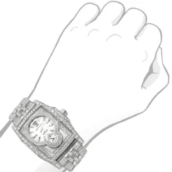 Introducing the unique bust-down Breitling for Bentley Flying B men’s diamond watch. This luxurious timepiece is crafted from the finest stainless steel and features a 38.5mm case with a white dial, chronograph subdial, and silver-tone hands. The bezel and case are encrusted with 20ct of sparkling white diamonds, while the bracelet is adorned with an additional diamond for a truly unique look. The scratch-resistant sapphire crystal ensures that your watch will remain in pristine condition for years to come. The watch is powered by automatic movement and features a date indicator and deployant clasp for added convenience. With its tonneau shape and luxurious design, this watch is sure to make a statement wherever you go. Whether you’re looking for a unique gift or a timeless timepiece for yourself, the luxury diamond Breitling Bentley watch is a perfect choice. This men’s diamond watch is water resistant, comes in retail box and 5-year warranty from ItsHot.com.