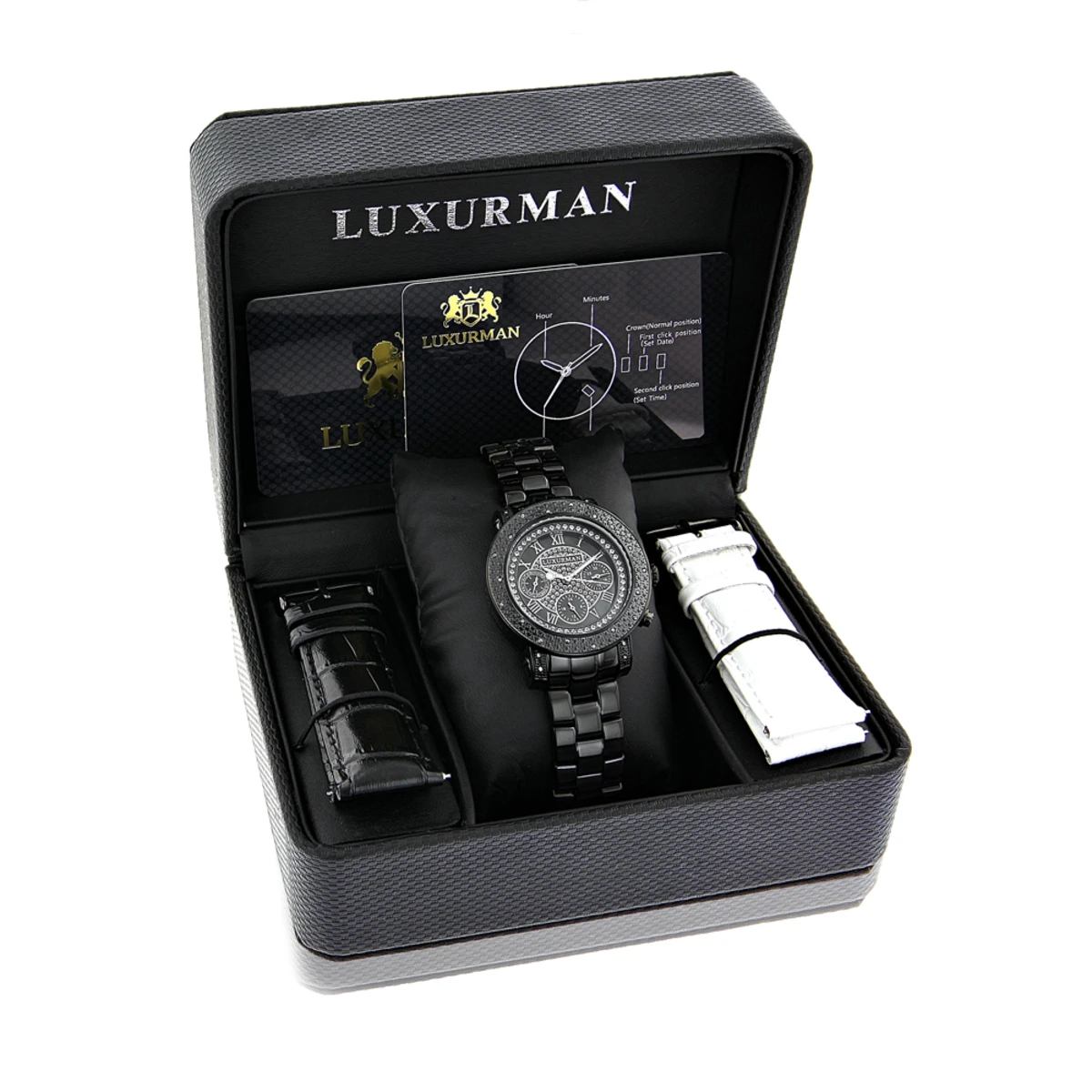 Introducing a unique Luxurman Black Diamond Watch from our Unisex Diamond Watches collection; quality made, this all black plated stainless steel watch features 0.3 carats of diamonds and comes with 2 extra leather bands in different colors.
